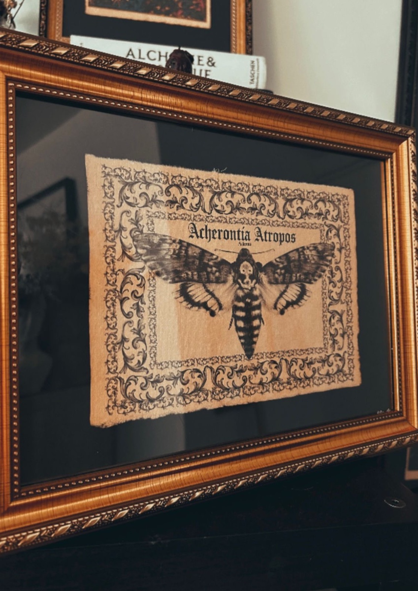 Sphinx tête de mort avec son cadre ornemental inspiré de motifs du XIXème siècle