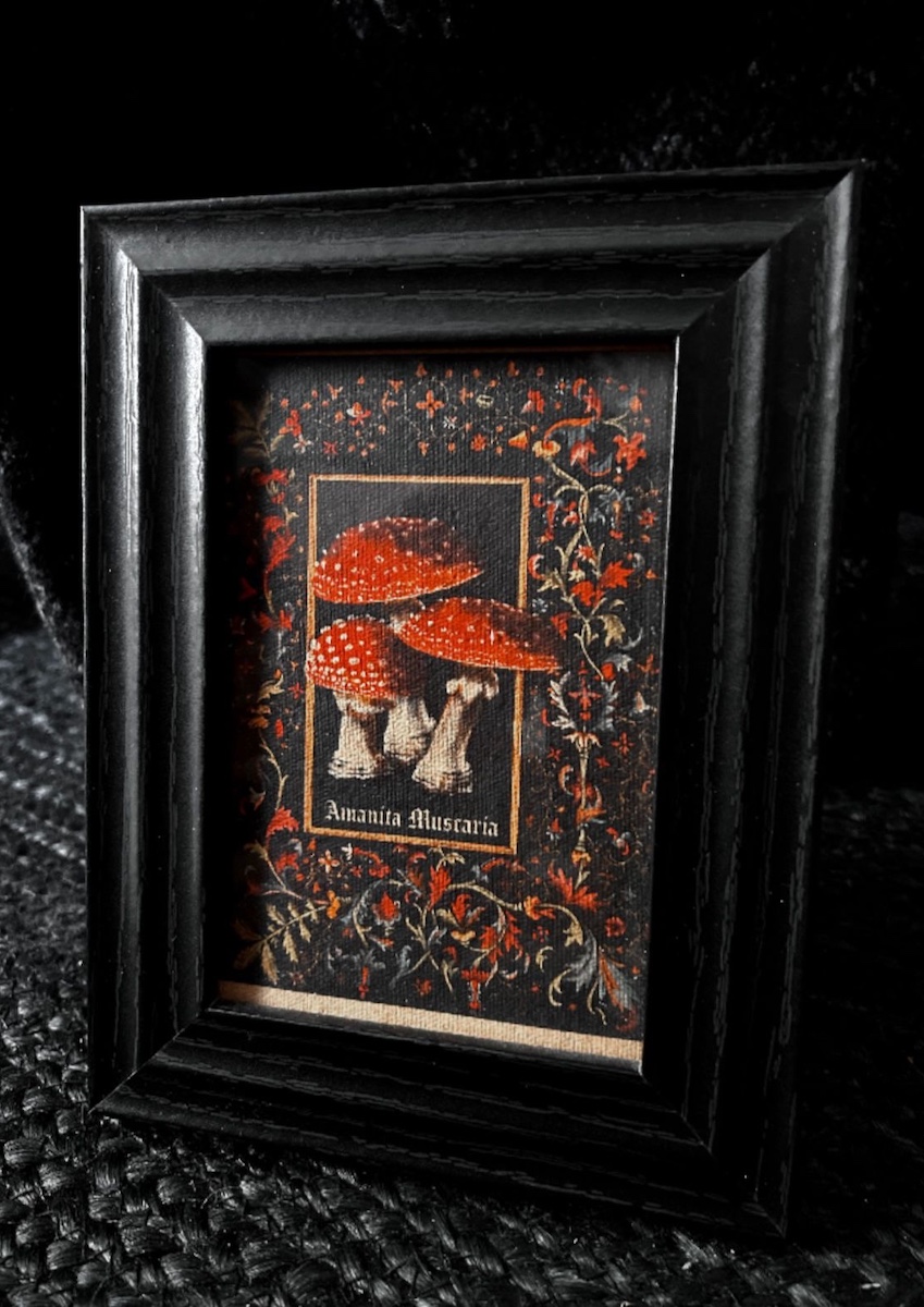 Amanite Tue-Mouches avec leur cadre floral qui puise son inspiration dans des enluminures médiévales
