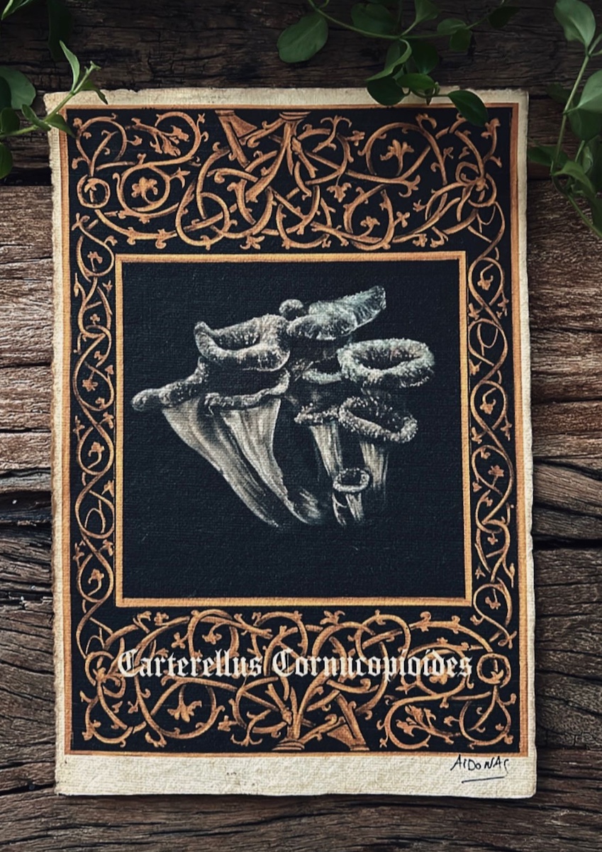 Trompettes de la Mort avec leur cadre floral qui puise son inspiration dans des enluminures médiévales