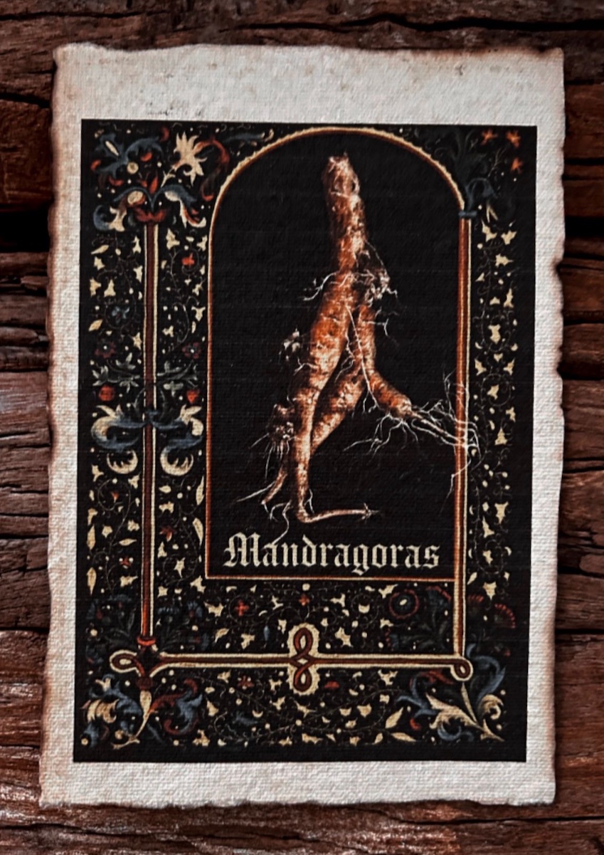 Mandragore avec son cadre floral qui puise son inspiration dans des enluminures médiévales